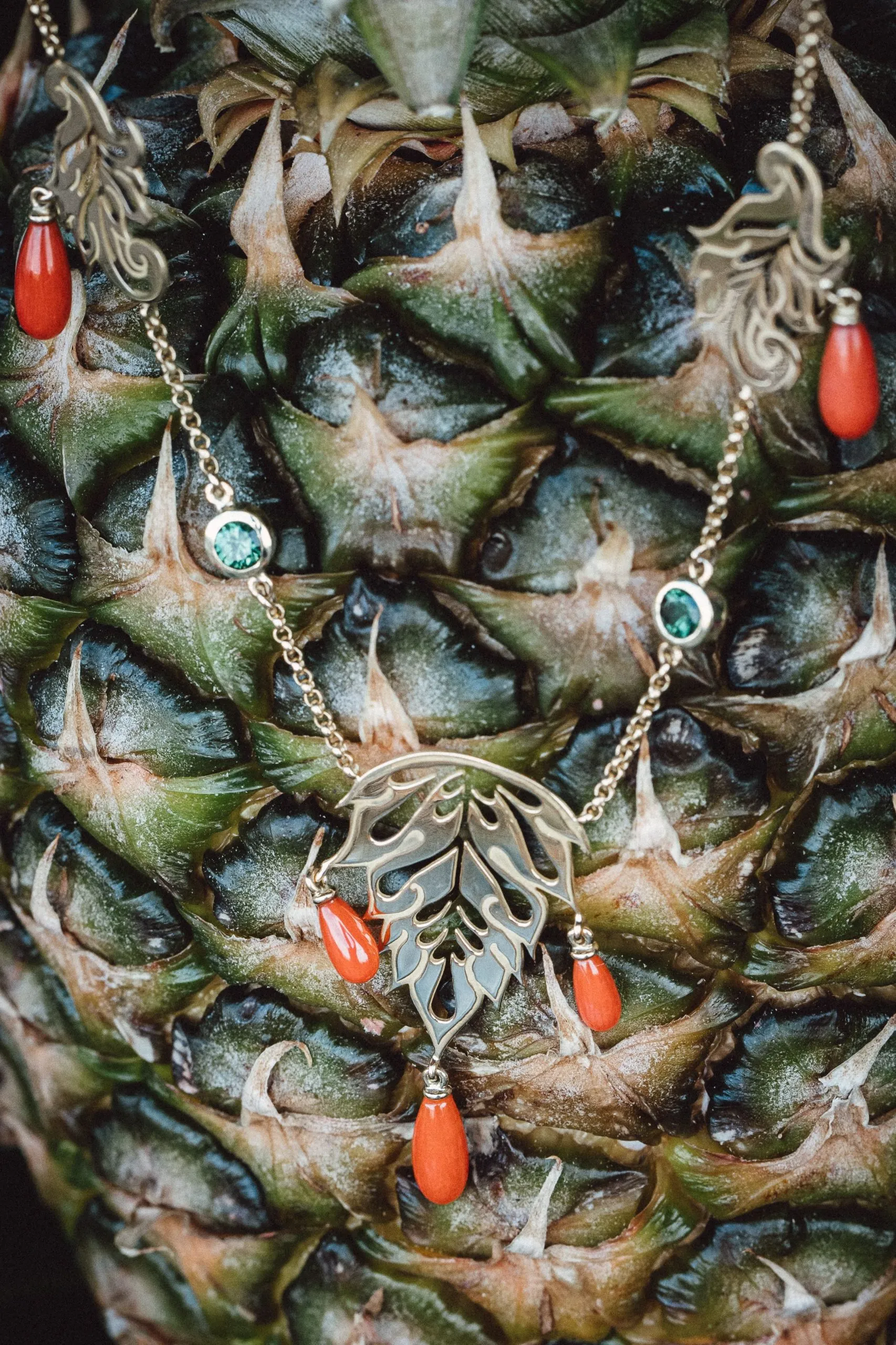 In diesem Schmuck, Collier und Ohrhänger wurden wie gewohnt recyceltes Gold in einen warmen satten Gelbgold als Blütenornament verarbeitet. Der Entwurf stammt von Nicole Schönemann, mit seinen antiken Korallentropfen und in Grüngold gefasste Tsavoriten . Die eingearbeiteten Akanthusblätter stehen für die “Liebe zur Kunst. Nichts kann uns trennen”.