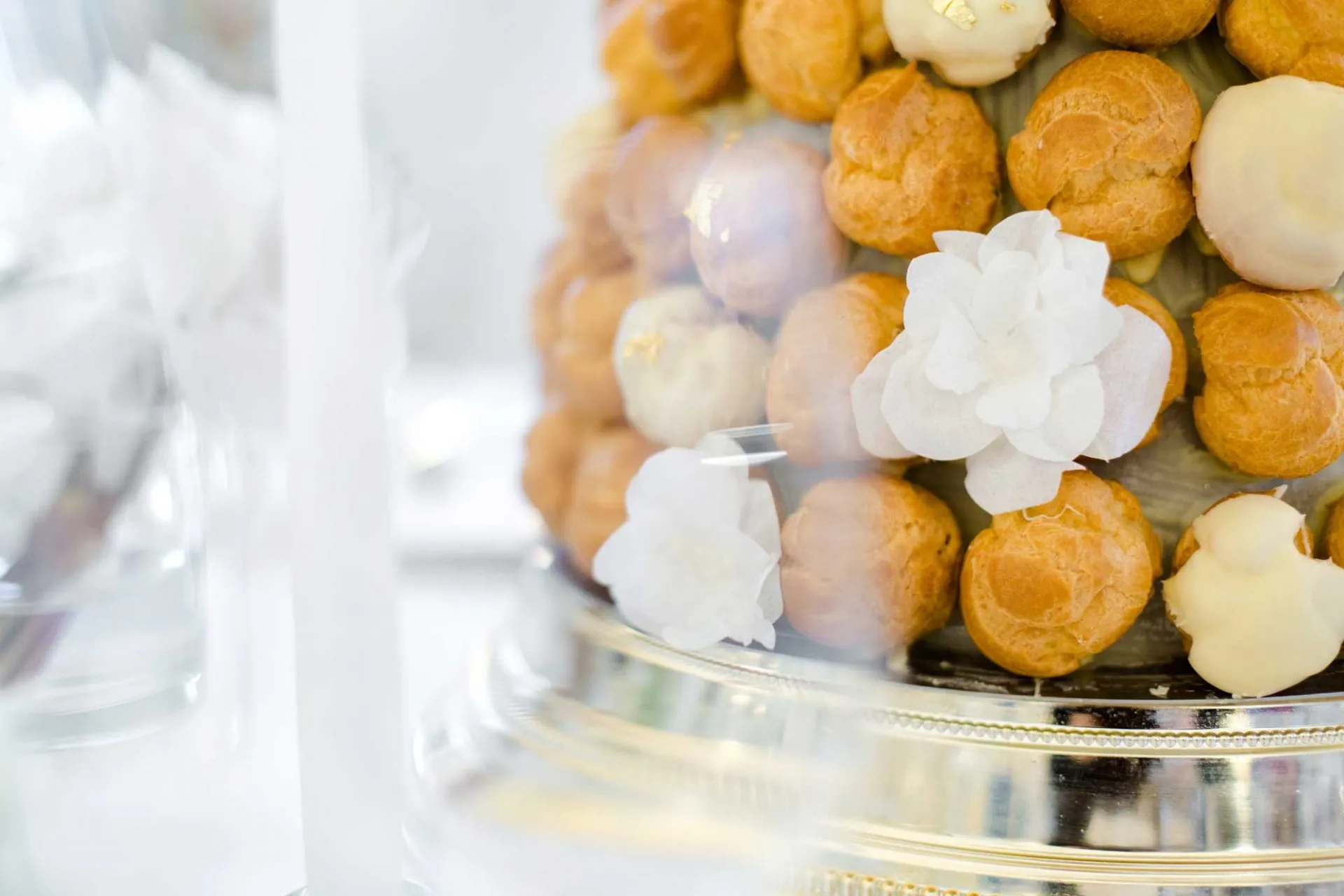 Das fängt bei der Tischdekoration mit den weißen Kerzen und Blumen an, die durch den bewussten Einsatz goldener Elemente, wie dem goldenem Besteck, goldener Teller mit Glascloches oder den vergoldeten Tellerrändern edel betont wird. Eine Besonderheit dürfte auch die französische Croquembouche von Rocaille sein, an der sich die Gäste statt einer klassischen Hochzeitstorte erfreuen dürfen.